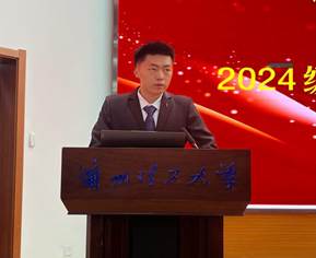 研究生代表 2022 级硕士李浩然向新生们分享了在校学习感悟。他鼓励 24 届新生要心怀壮志,勇于前行,积极收集研究前沿资讯,紧跟学术发展的步伐。其次是积极实践,用研究深化理论,将论文写在祖国大地,为解决实际问题贡献自己的智慧。最后祝愿新生们积极探索,在研究生生涯中收获累累硕果。